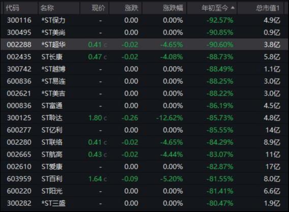 Choice 数据显示,今年以来 ST 板块指数累计跌幅近 40%,跌幅远超大盘;其中 78 只个股跌幅超过 50%,*ST 保力、*ST 美尚、*ST 超华三只个股跌幅均超 90%。