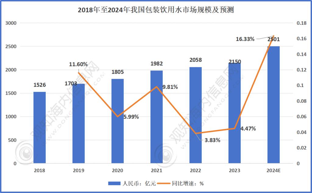 因为此前根据多家研究机构预测,中国饮用水市场正处于高速发展阶段,无论是市场规模还是市场需求,都呈现出极为广阔的发展空间。据观知海内信息网的数据,从 2025 年至 2025 年,中国包装饮用水市场规模正在逐年递增,年均增长率达到 7.14%,并预计 2024 年中国包装饮用水市场规模达到 2501 亿元,同比增速预计达到 16.33%。