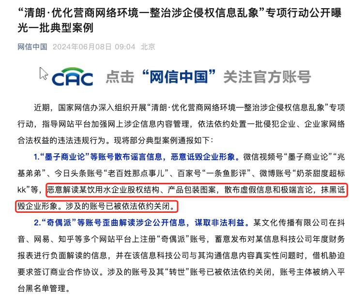 消息显示,今年 6 月份," 网信中国 " 通报了典型案例,一批造谣农夫山泉的社交账号被封,包括微博、抖音、百家号等平台的账号。通报的这些账号涉嫌恶意解读农夫山泉企业股权结构、产品包装图案,散布虚假信息和极端言论,抹黑诋毁企业形象。