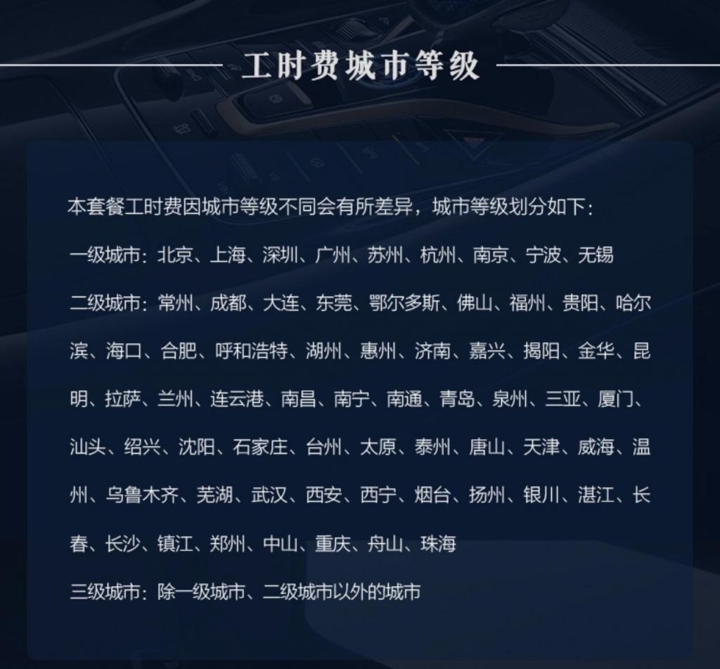 按照比亚迪官方划分的城市等级,北京、上海、广州、深圳、苏州、杭州、南京、宁波、无锡按照一线城市工时费计算,常州、成都、大连、东莞、鄂尔多斯等城市按照二线城市工时费计算。
