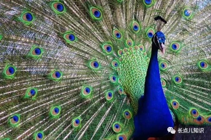 我们看到的大多数孔雀羽毛都是带有眼状斑纹的,并且有多种颜色组成,蓝,绿,黄,红等,当孔雀遇到攻击时,它们就会不停的抖动羽毛,发出沙沙的声音,伴随着一个个“眼睛”不停抖动,就会让敌人产生一定的畏惧。