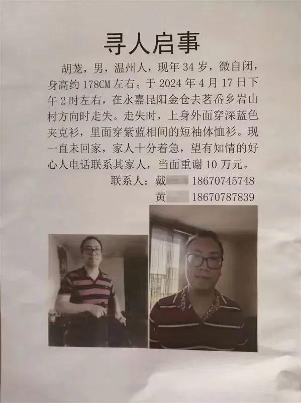 据家属发布寻人启事,胡茏,男,现年 34 岁,身高约 1 米 78,温州鹿城区人,有轻微自闭。2024 年 4 月 17 日下午 2 时左右,他在永嘉昆阳金仓去往茗岙乡岩山村方向时走失,当时上身外面穿深蓝色夹克衫,里面穿紫蓝相间的短袖 T 恤衫。现一直未回家,家人万分着急,望有知情的市民电话联系其家人,当面重谢 10 万元。