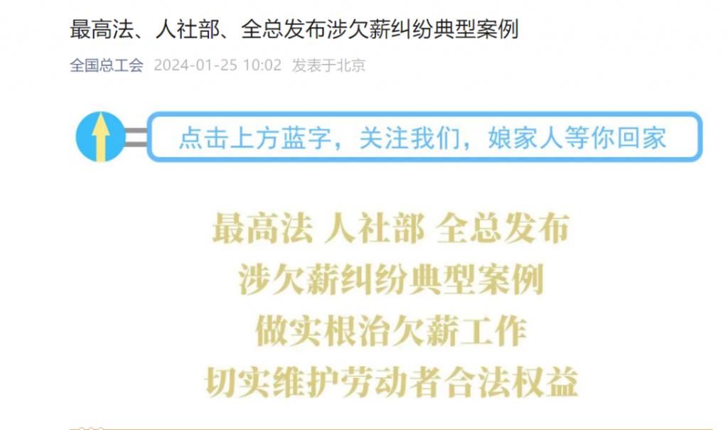 为深入学习贯彻党的二十大关于完善劳动者权益保障制度、中央经济工作会议关于要求保障农民工工资按时足额发放的重要部署,最高人民法院、人力资源社会保障部、中华全国总工会联合发布涉欠薪纠纷典型案例,通过案例明晰欠薪纠纷多元化解决途径,促进保障制度落实落细,从源头遏制欠薪问题发生,健全根治欠薪长效机制,有效维护劳动者合法权益和社会和谐稳定。