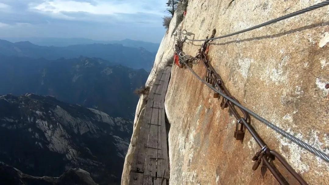 长空栈道位于华山南峰东侧山腰,是华山派第一代宗师元代高道贺志真为远离尘世静修成仙,在万仞绝壁上镶嵌石钉搭木椽而筑。