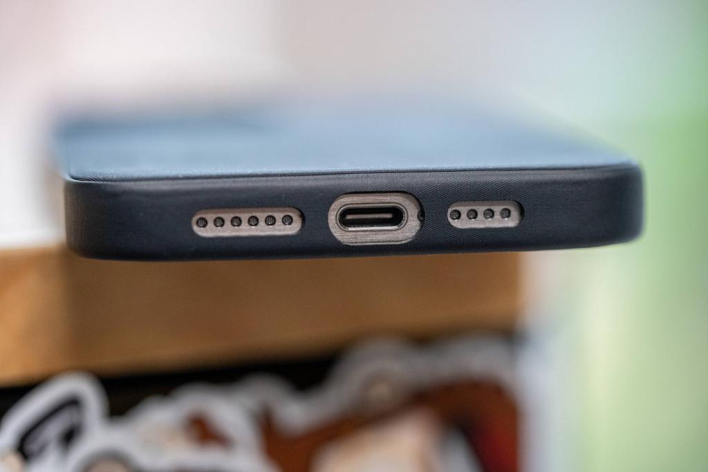 ▲ iPhone 15 Pro 精致斜纹保护壳的错位孔位。图片来源:512 Pixels