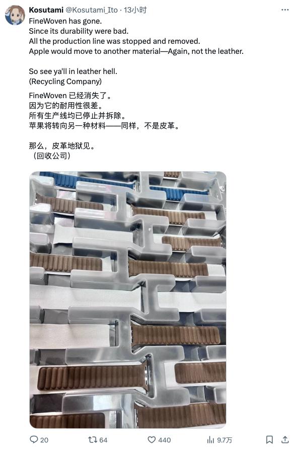 最近,X 用户 @Kosutami_Ito 爆料称苹果已停止生产精织斜纹配件。关于这次停产的原因,主要是由于精织斜纹配件的耐用性很差。