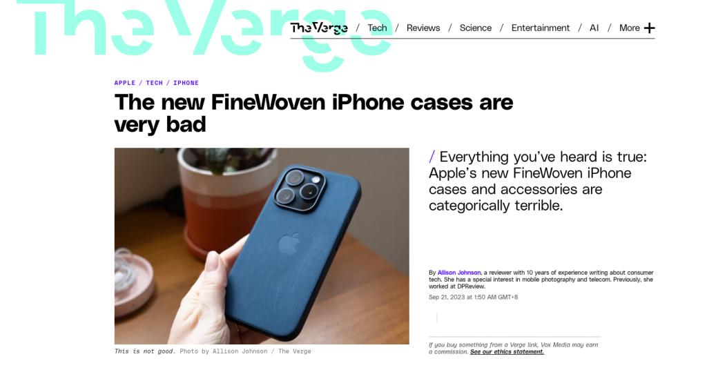 The Verge 在上手精织斜纹保护壳后,第一时间就发文称「iPhone 新的精致斜纹保护壳非常糟糕」。
