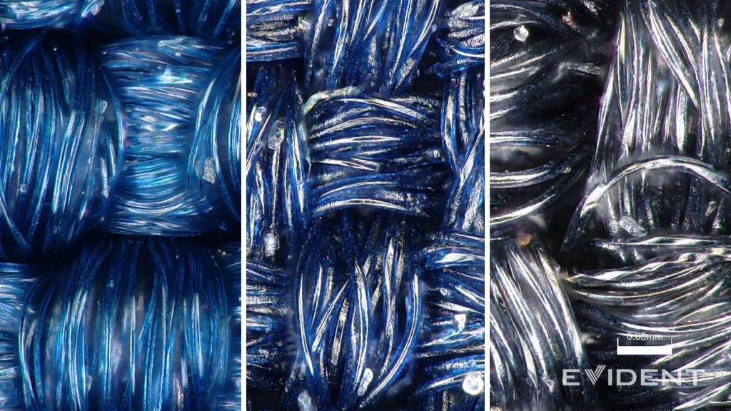 ▲ 左图:苹果精织斜纹材质。中图:始祖鸟夹克纤维。右图:巴塔哥尼亚夹克纤维。图片来源:iFixit
