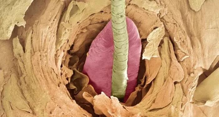▲这是在高倍电子显微镜下的脸部皮肤毛孔照片。粉红色显示的就是一个螨虫的尾巴。更清晰的螨虫照片就不放了,看上去有点恶心。