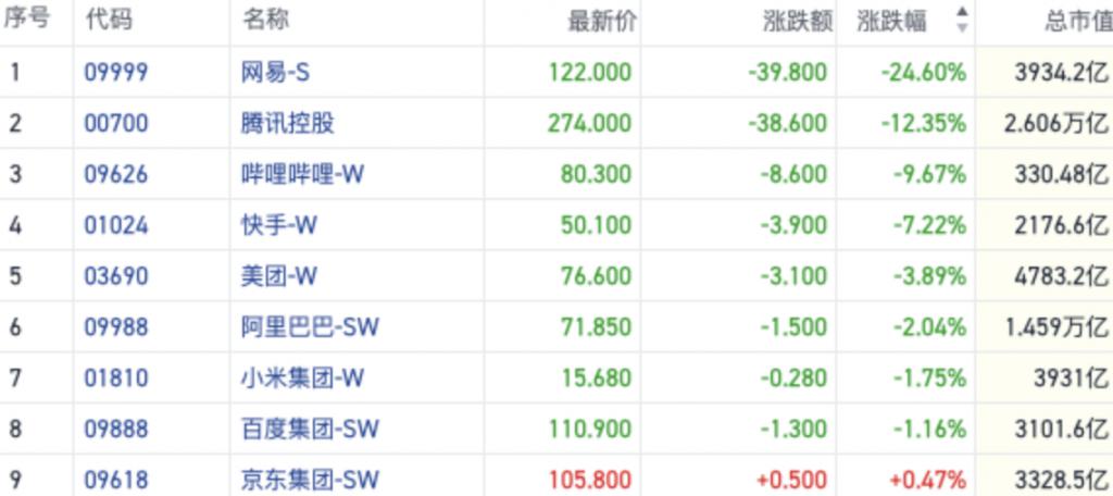 今日,以腾讯、网易为首的游戏股暴跌,网易最终下跌 24.6%,腾讯大跌超 12%。权重科技股则集体跟跌,哔哩哔哩跌近 10%,快手、美团、阿里巴巴集体下行,对大盘行情冲击明显。