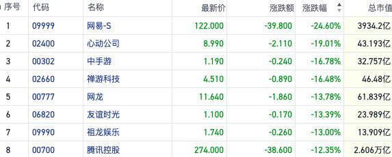 今日,港股市场上的关注度均被游戏股吸引,包括网易、腾讯在内,游戏股今日跌幅达两位数的个股就有 10 家左右。