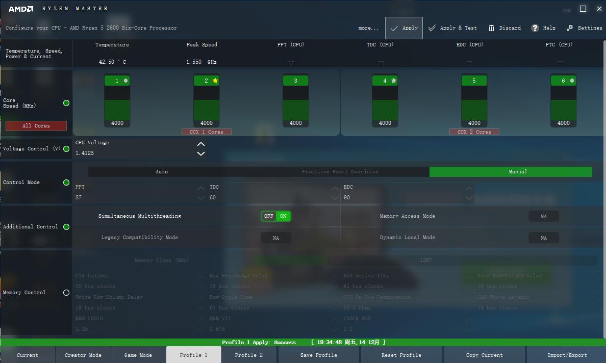 此时,这款Ryzen 2600跑出了112449的成绩,没有很理想。接下来我们又用AMD Ryzen Master超频软件进行超频,下载运行后,将6个核心同时拉到4G,一点一点增加电压,发现电压加到1.4125V后,可以通过烤机验证,