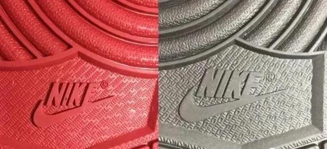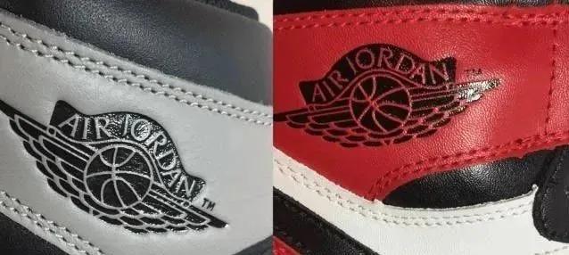 把真假AJ放在一起对比(灰真红假),你会发现这个假AJ的logo工艺其实也挺好。假AJ的图案完全是对的,只不过真AJ的logo浮雕比较深,假货都做到这个份儿上了,的确是真假难辨;