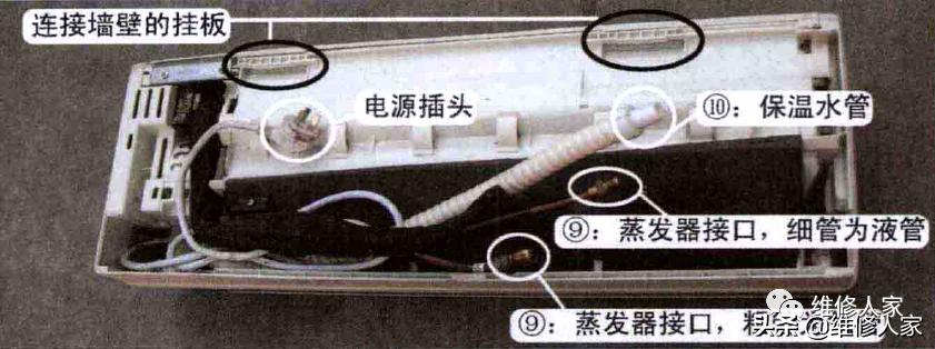 ⑨ 蒸发器接口:与来自室外机组的管道连接(粗管为气管,细管为液管)。