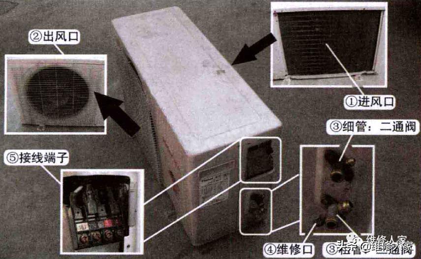 ③ 管道接口:连接室内机组管道(粗管为气管接三通阀,细管为液管接二通阀)。