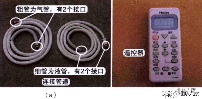 连接管道用于连接室内机和室外机的制冷系统,完成制冷(制热)循环,其为制冷系统的一 部分,实物外形见下图(a)。粗管连接室内机蒸发器出口和室外机三通阀,细管连接室内机蒸发器进口和室外机二通阀;由于细管流通的制冷剂为液体,粗管流通的制冷剂为气体,所以细管也称为液管或高压管,粗管也称为气管或低压管;材质早期多为铜管,也有部分使用铝塑管。