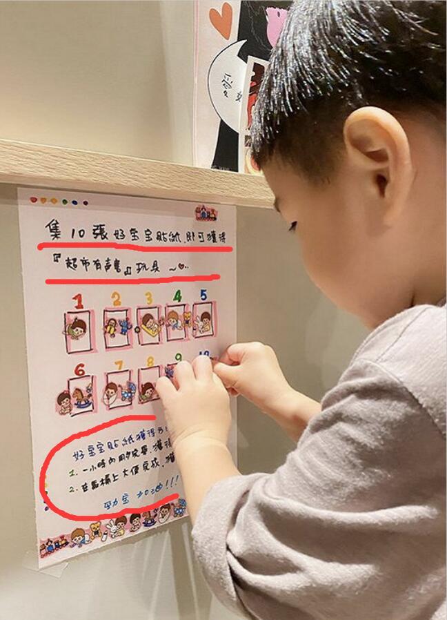 同时,细心的网友还发现了Ella的激励教育法哦,原来宝贝要集齐10张小贴纸才能获得超市的有声玩具。然后还规定在一定时间范围内做到某件事情才可以有奖励,不少网友对Ella大赞教育法很好。