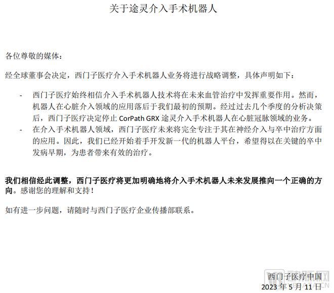 西门子医疗中国也在 5 月 11 日迅速做出了回应。西门子医疗始终相信介入手术机器人技术将在未来血管治疗中发挥重要作用。未来,西门子医疗将专注血管介入机器人在神经介入领域的应用。