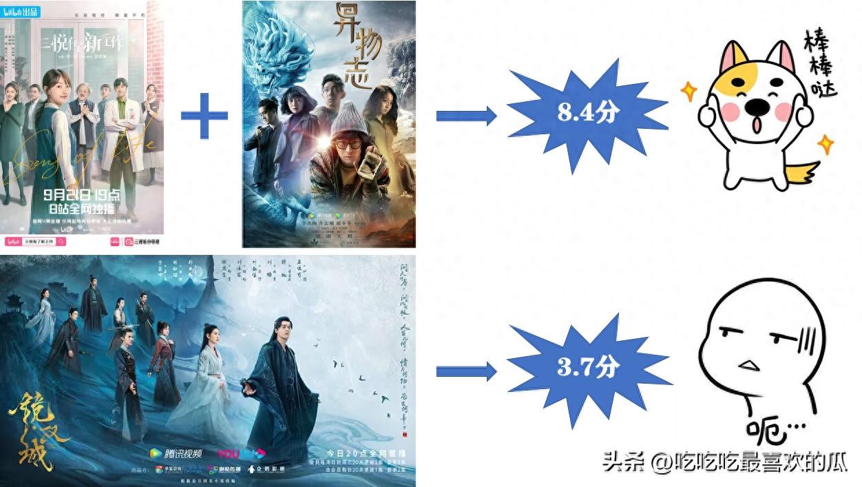 ★按评分分值看,最高分有两部,分别为《三悦有了新工作》和《异物志》,都是8.4分,最低分为《镜·双城》3.7分;