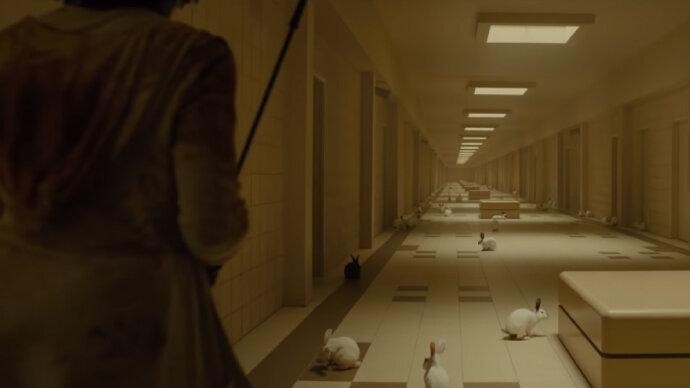 随着雅德蕾德一步步深入地下实验机构,从铁笼脱逃的兔子数量越来越多,她也越来越接近事实真相,这段戏可说将「进入兔子洞」这句片语转化成了电影语言。