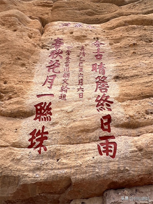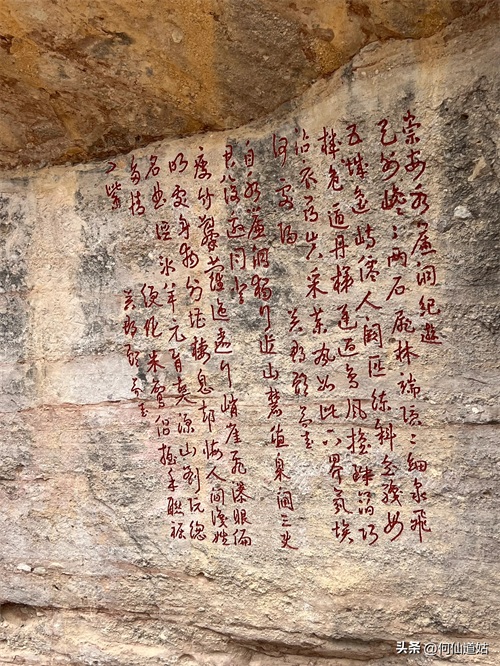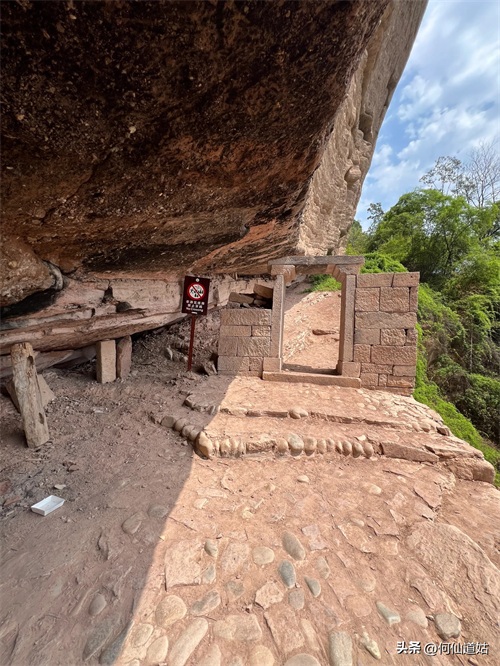 水潭旁边向上望,觉得洞口不高,但登上去要十来分钟。洞口实际是赤壁的凹口,像一个屋檐,长度可能百多米,由于没有雨水,干巴巴的,地面铺了一层面粉般的淡红砂石,犹如到了沙漠。左侧则有一座三贤祠,奉祀宋朝大儒刘子恽、朱熹、刘珙的三贤祠,是奉祀孔子、老子、释迦牟尼的三教堂的遗址。曾是一个名扬天下的地方,因为朱熹在此论道过。