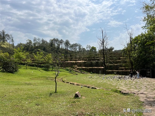 到了山脚,便是上山路,大约三百多米,挺陡的路,间中有台阶,上去后是一个草坪,一个小伙子养了一群鸽子,若是买他一把饲料引诱,则鸽子会飞到你手臂或肩膀上,或者煽动着翅膀在你手心里啄食,让你拍出各种精彩的作品。