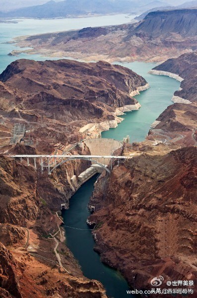 俯视胡佛水坝(Hoover Dam)位于亚利桑那州的西北部,93号洲际高速公路上,内华达州及亚利桑那州的西北部交界处,因亚利桑那及内华达两州有一小时之时差,故水坝两端各设有一时钟以方便过客对时。从拉斯维加斯出发向东南方向行驶约40公里处。工程庞大,建成后对工农业发展起着巨大的作用。因此它在世界水利工程行列中占有重要的地位。胡佛水坝的建造耗费了大量资金,动员了大批人力,于1936年竣工并交付使用。它是一座拱门式重力人造混凝土水坝。坝高220米,底宽200米,顶宽14米,堤长377米。这样巨大的水坝在世界上是不多见的。坝下的科罗拉多河原本是美国最深、水流最湍急的河流,如今缓缓而行,就像一头驯服的野兽。