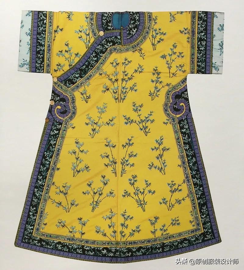 图十二清光绪明黄色江绸绣三蓝竹枝纹夹氅衣
