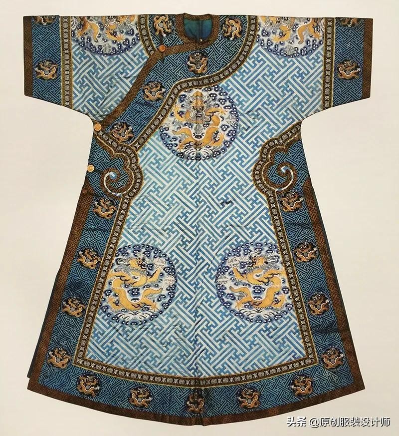 图六 清代品月色缎平金绣万字地三蓝八团云龙纹棉氅衣