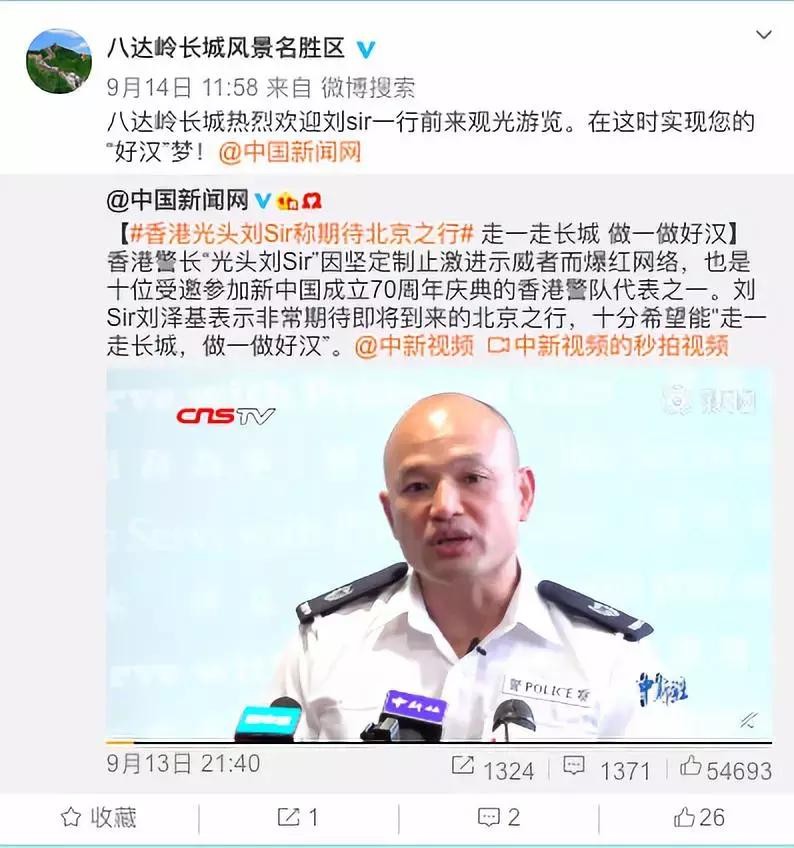 9月13日,香港爱国警察光头刘sir(刘泽基)在接受中新网采访时坦言,作为中国人,想去长城看看。可不少网友却担心景区游人太多,劝刘sir三思而行。