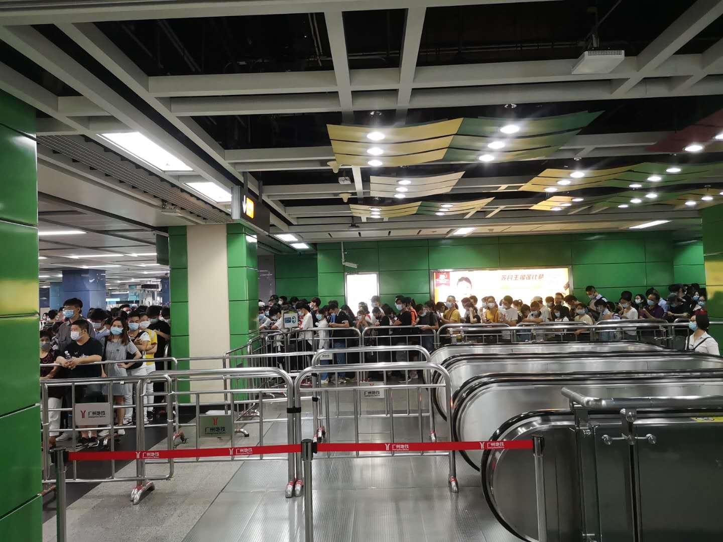 通过漫长的等待队伍只是第一关,接下来还有排队下电梯和贴紧人群挤上车这两关。