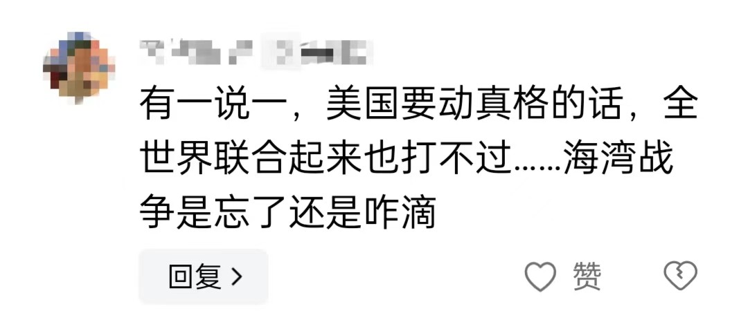 他认为从海湾战争可以看出,即便是世界各国联手也打不过美国,只不过是美国现在还没动真格罢了。