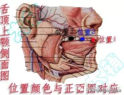 其正确的操作方法是:把口唇轻闭、牙齿扣拢,舌尖即会自然地抵在上腭与上牙龈之间(实为龈交穴内侧),而绝不可将舌头翘起用力抵住上腭。位置1 。