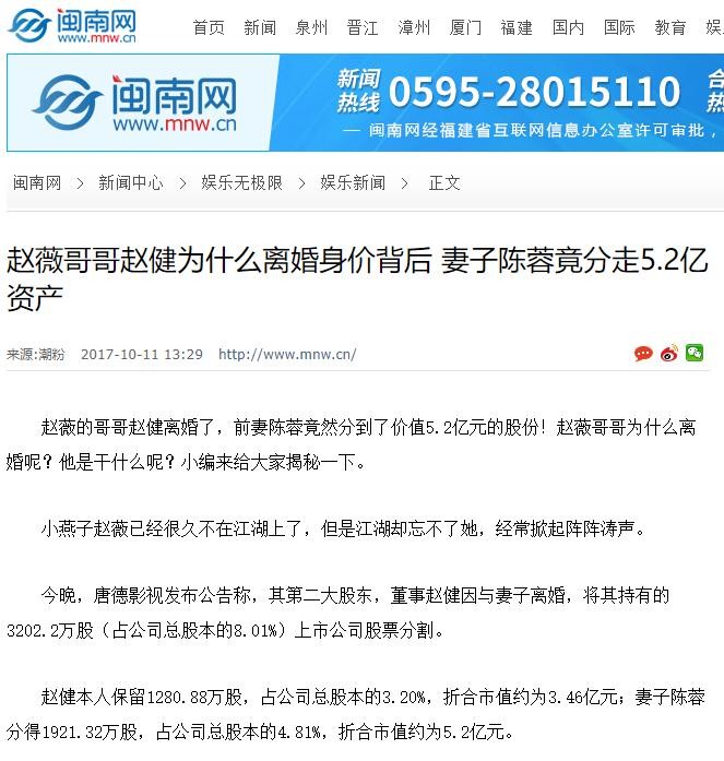 以上信息来源:闽南网2017年10月11日“赵薇哥哥赵健为什么离婚身价背后,妻子陈蓉竟分走5.2亿资产”