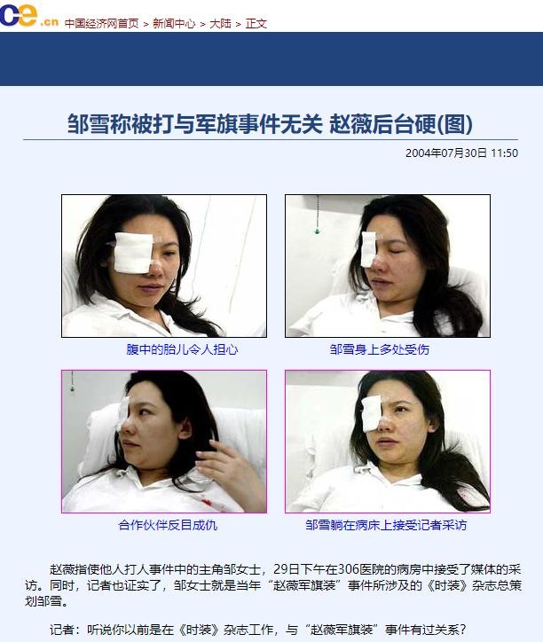 以上信息来源:中国经济网2004年7月30日“邹雪称被打与军旗事件无关,赵薇后台硬”