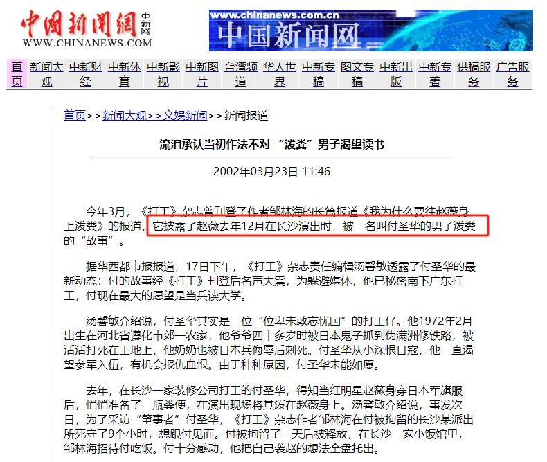 在2001年12月份的时候,赵薇前往长沙演出,却被一名突然出现的陌生男子泼了一身粪水。