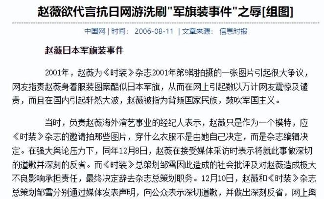 以上信息来源:中国网2006年8月11日“赵薇欲代言抗日网游洗刷‘军旗装事件’之辱”
