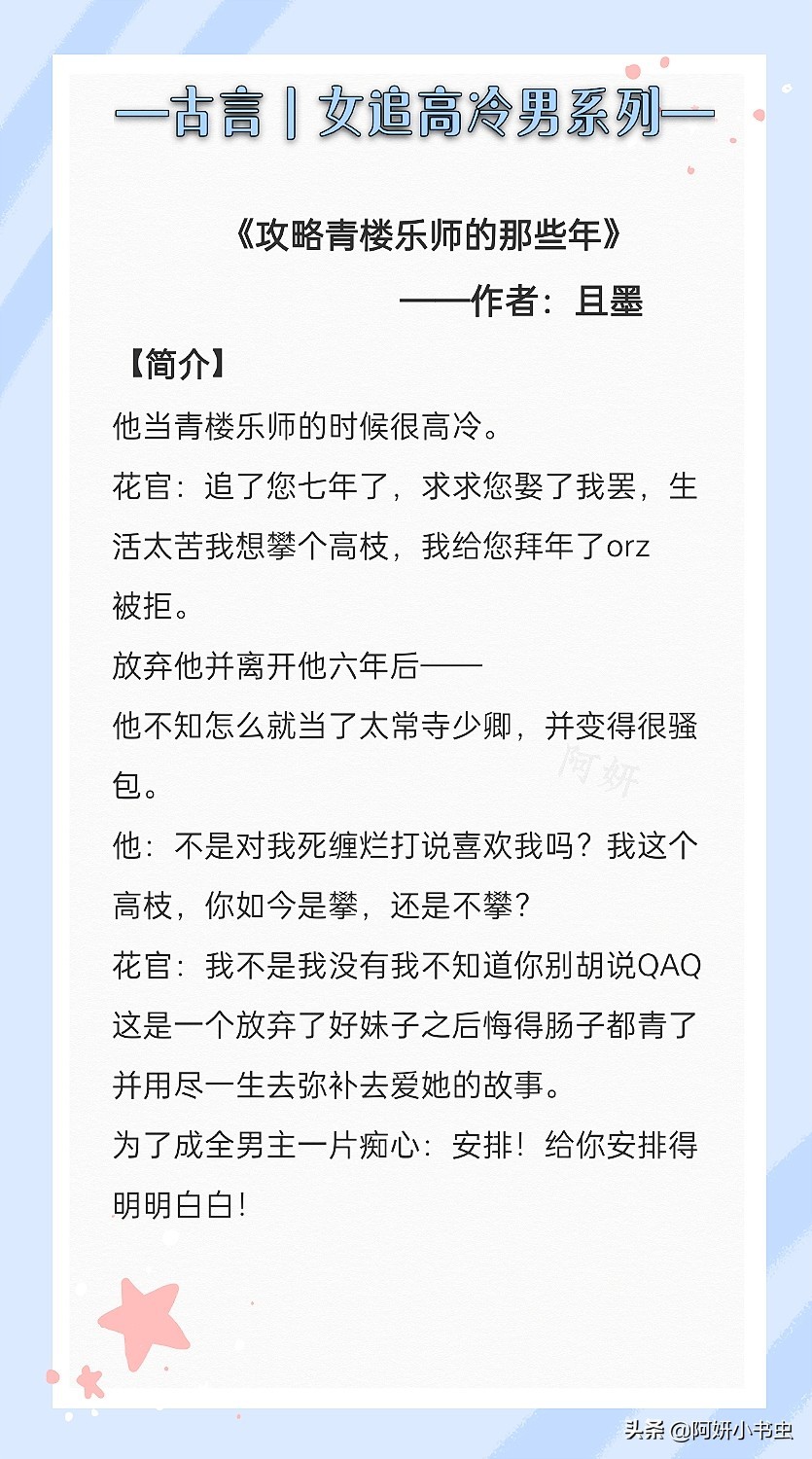 今天推荐的是:3本女追高冷男古言文!俗话说男追女隔层山,女追男隔层纱。只要脸皮厚,不怕闷骚高冷男神不上钩!今天的文都是女主看中男主,然后疯狂狂追,撩拨走一波~虽然基调是轻松的,但描述了暗恋中的追求那种心酸的情绪。不是虐文的小说,我看了却也红了眼。男主傲娇死不认爱,其实内心早已非女主不可,只是苦了女主。后期男主花式追妻。看的时候很爽。文笔都很不错!强推!!热门女追男的小说《春日宴》《咬定卿卿不放松》《表妹万福》等,很好看,一定要去看!