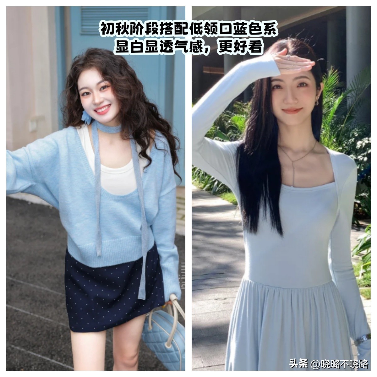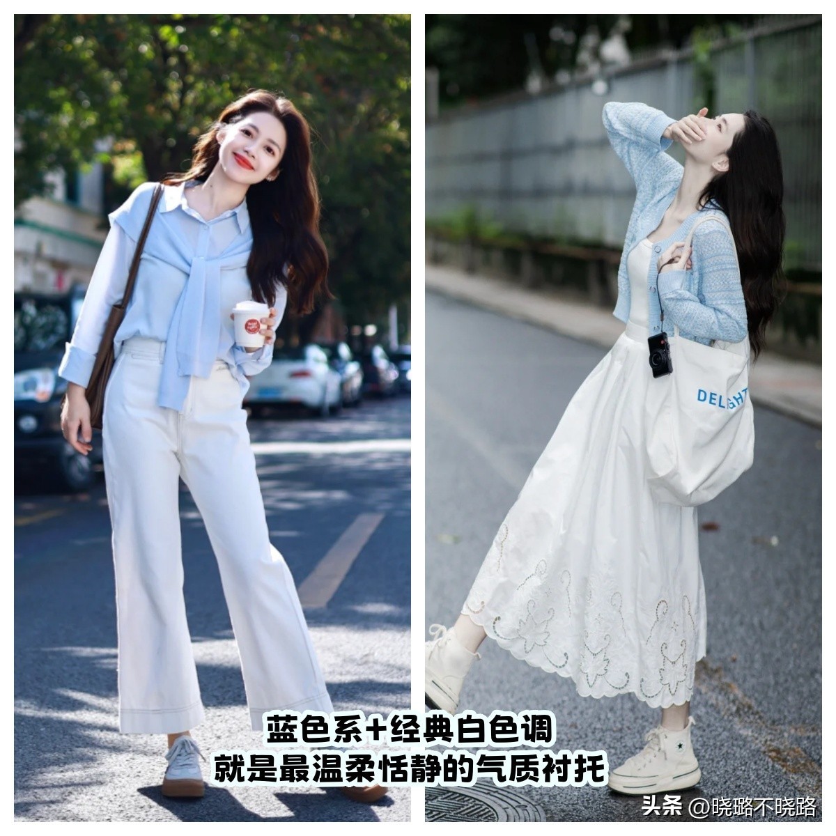 显白的蓝色系除了自己单独搭配之外,最经典的搭配组合可以说算得上是白色调最契合了,尤其是在本就容易沉闷的秋季当中将彩色和提亮的白色调组合起来,是更具优势的存在了,衬得整个人都白皙干净,且气质的状态更是优雅温柔显高级感。