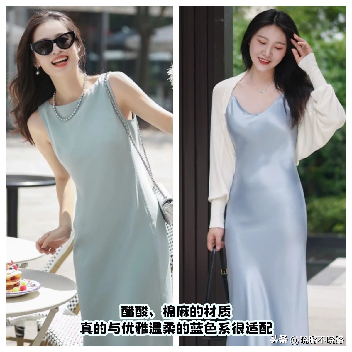 蓝色调的搭配单品其实就很建议大家可以将材质多注重一点,能够穿出富有气质的优势效果也是很有必要的哦,例如像醋酸、缎面的材质本身就具有一些小量的反光效果,衬托的蓝色调更为显白了很多,或者百搭舒适的棉麻面料垂感更重一些呢。