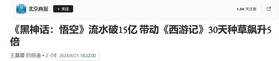 北京商报2024年8月21日——《黑神话:悟空》流水破15亿 带动《西游记》30天种草飙升5倍