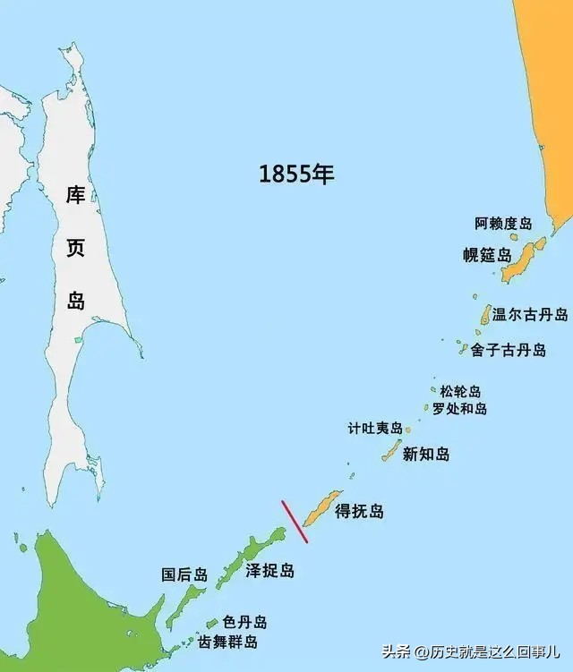 1855年,日俄两国签署《日俄和亲通好条约》,瓜分了千岛群岛,约定以择捉岛(伊图鲁普岛)与得抚岛(乌鲁普岛)之间的弗里斯海峡(择捉水道)为界,海峡以南归日本,以北归俄罗斯。萨哈林岛(即库页岛或桦太岛)成为两国人都能居住之地。明治维新后,日本北海道开拓使次官黑田清隆主张放弃遥远的桦太并加快开发北海道。于是在1875年,日俄在圣彼得堡签署《库页岛千岛群岛交换条约》,日本放弃桦太将其让给俄罗斯;俄罗斯则将整个千岛群岛让给日本。