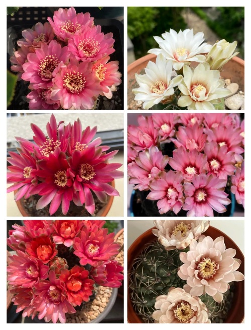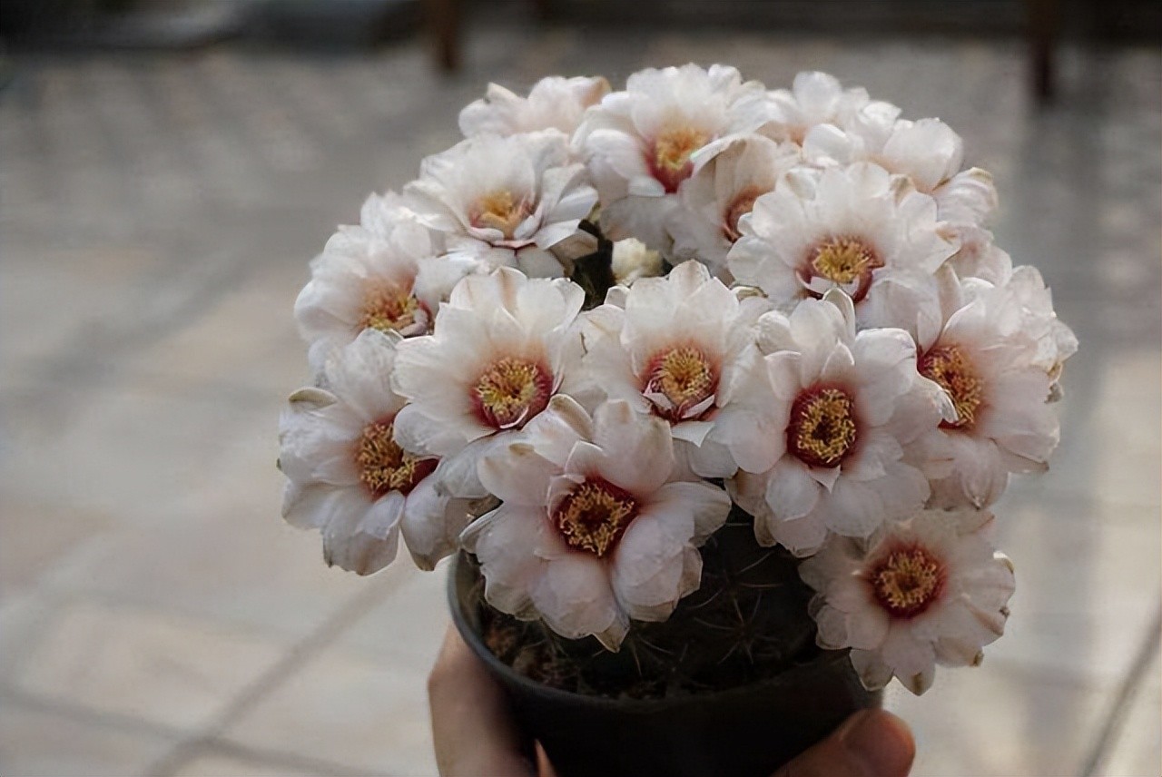 绯花玉的花朵通常长在球体的顶部位置,它一般会在夏季开花,花色也非常地丰富,白色、粉色、白绿、深红等等,不一而足,五彩纷呈。它是仙人球界里妥妥的开花机器,通常花期在5-11月份。