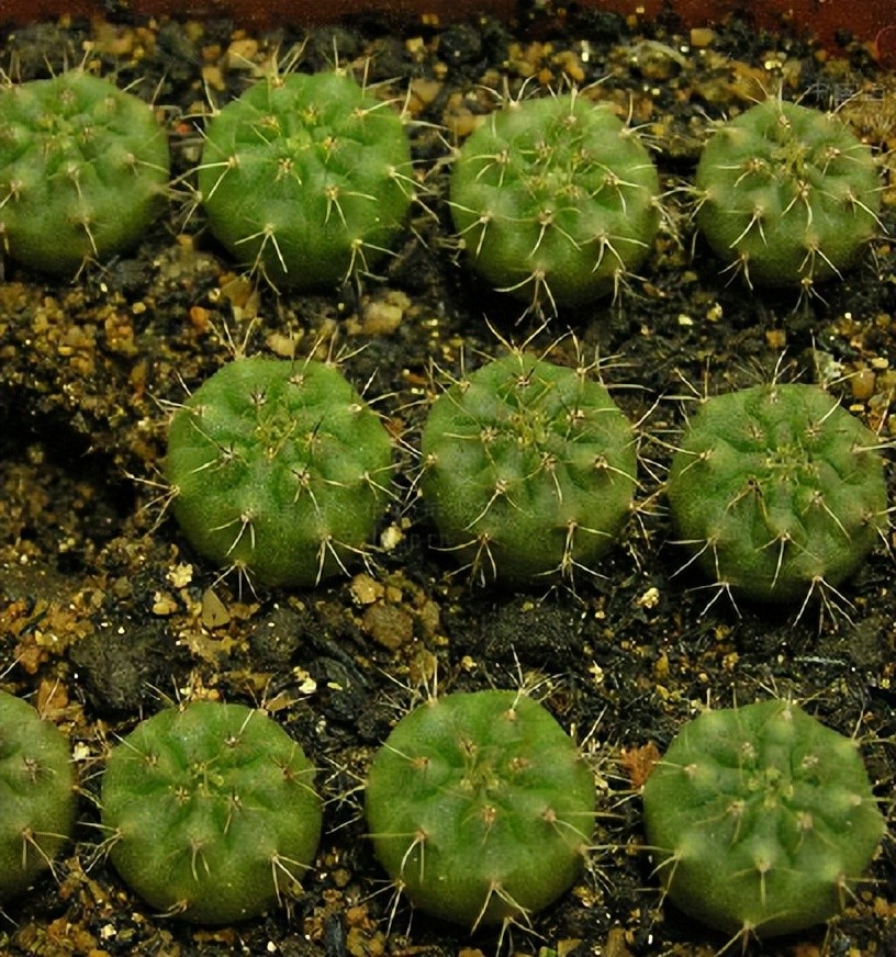 外形特征:植株呈扁球形,表皮墨绿色,刺针状,每个刺座带有5枚灰色周刺,它是仙人球里的小个代表,直径最大差不多也就10厘米的样子。