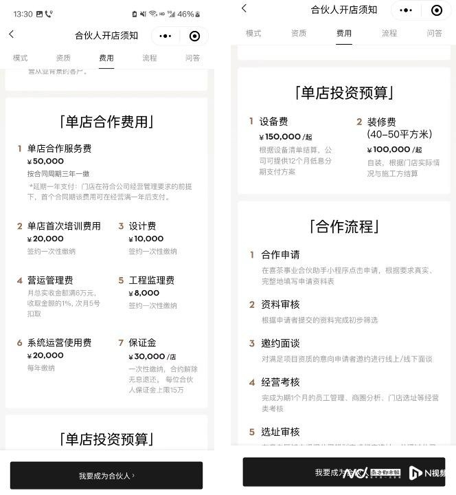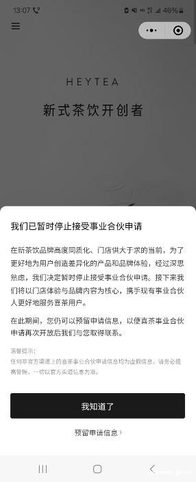 南都记者在喜茶官网“成为喜茶事业合伙人”入口进入后,页面立刻弹出“我们已暂时停止接受事业合伙申请”的通知,其理由为“在新茶饮品牌高度同质化、门店供大于求的当前,为了更好地为用户创造差异化的产品和品牌体验,经过深思熟虑,我们决定在那时停止接受事业合伙申请”。
