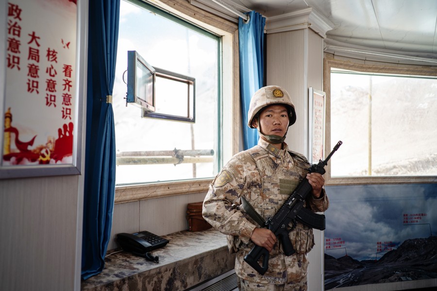 神仙湾边防连行政区隶属于和田地区皮山县,南距中印巴三国交界点。在神仙湾边防连的前哨楼里,去年刚刚入伍,一个月前被派往神仙湾的年轻战士关严旭正在站哨。海拔5000米之上,空气稀薄,说话都费力,战士们全副武装执勤,一站就是一个多小时。