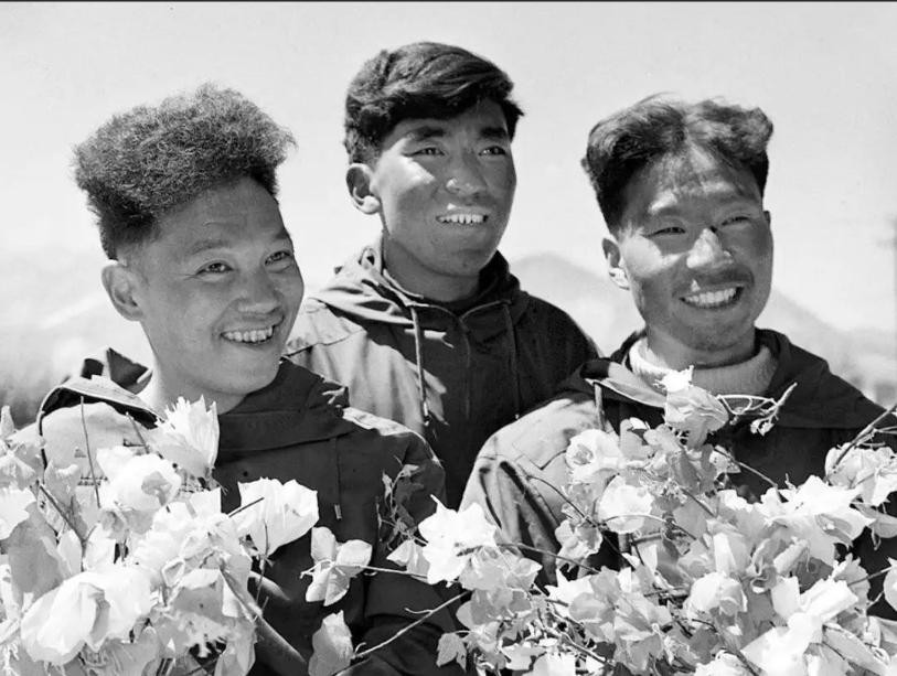 1960年5月25日,三名平均年龄仅24岁的中国登山队队员王富洲、贡布、屈银华成功从北坡登顶,将鲜艳的五星红旗插在了珠峰的顶端。这是中国人第一次登顶珠峰,也是人类第一次从北坡登顶珠峰!