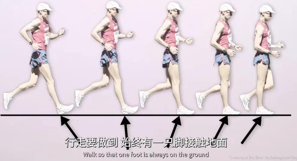 简单来说,竞走就是在走路的基础上,加快速度和技巧的一项运动。选手们得两腿交互迈步前进,而且任何时候都不能两脚同时离地!