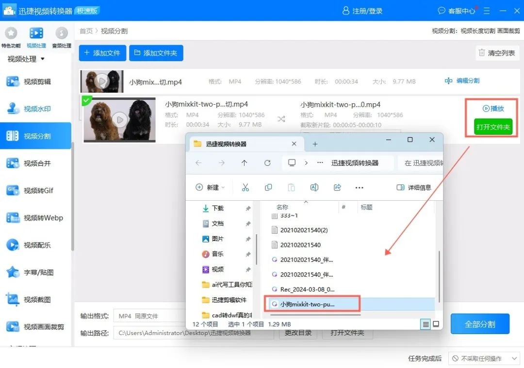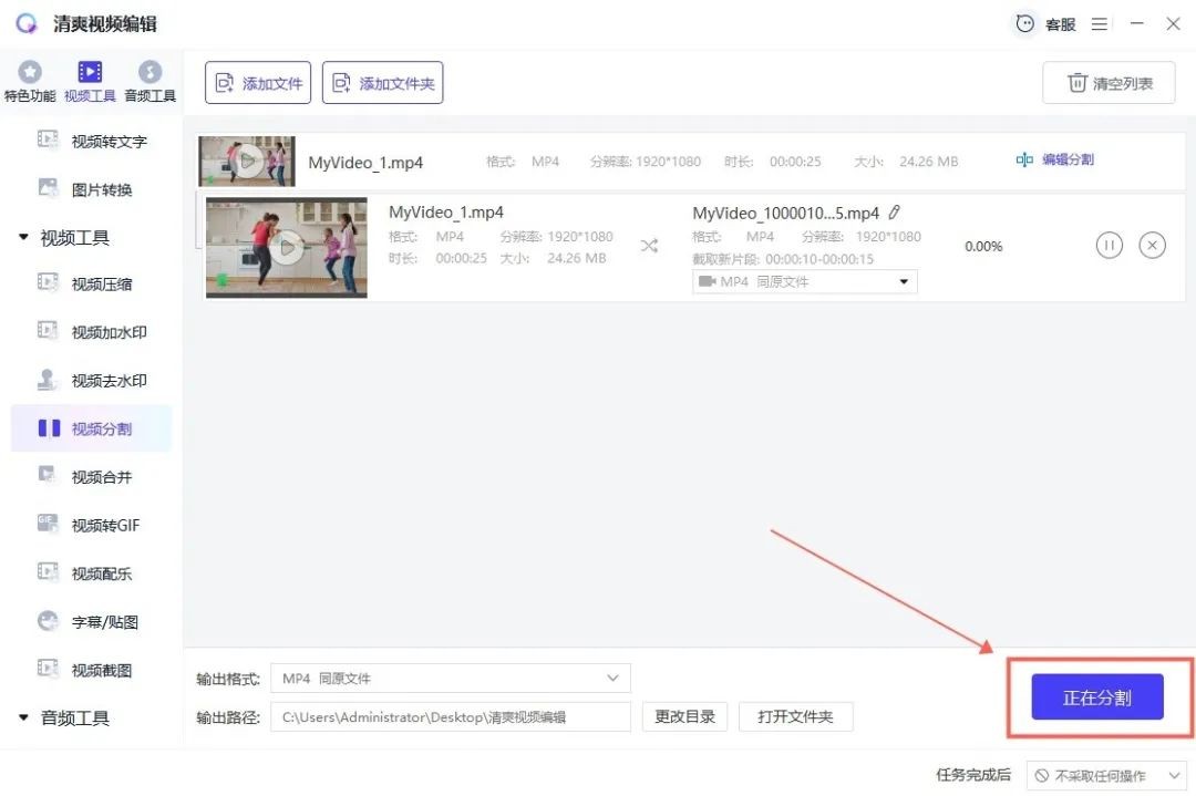 最后点击【全部分割】按钮,等待几秒就能得到截取的视频片段啦~
