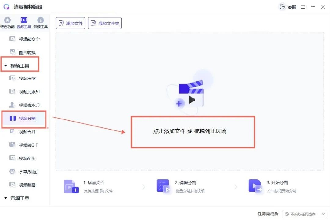 打开软件,在左侧点击选择‘视频工具’中的【视频分割】功能,导入需要截取的视频文件;